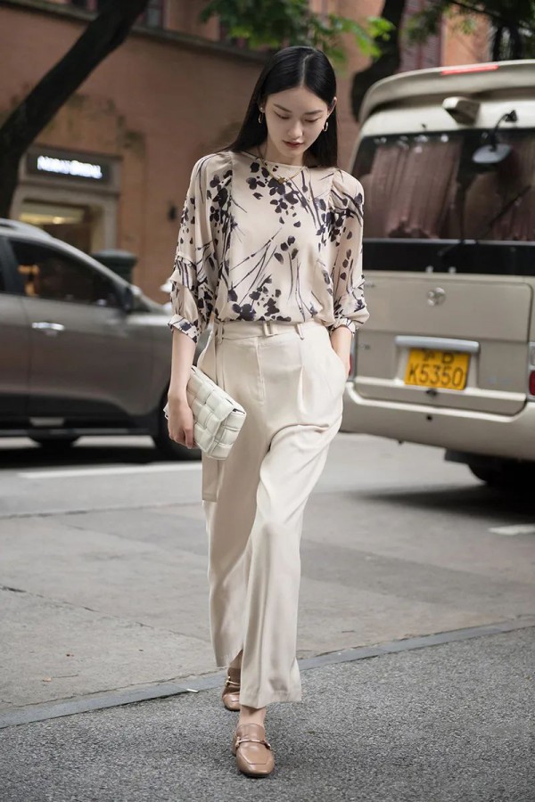 轻盈雪纺突破衬衫的落拓属性,保证柔软度与舒适感的同时,熊猫刺绣与领口飘带突显出的女性化精致,为通勤着装带来别致柔情。搭配同色系锥形裤平衡女人味,是职场中理性十足的仪式感。
