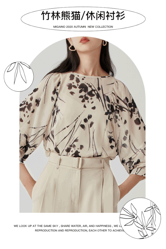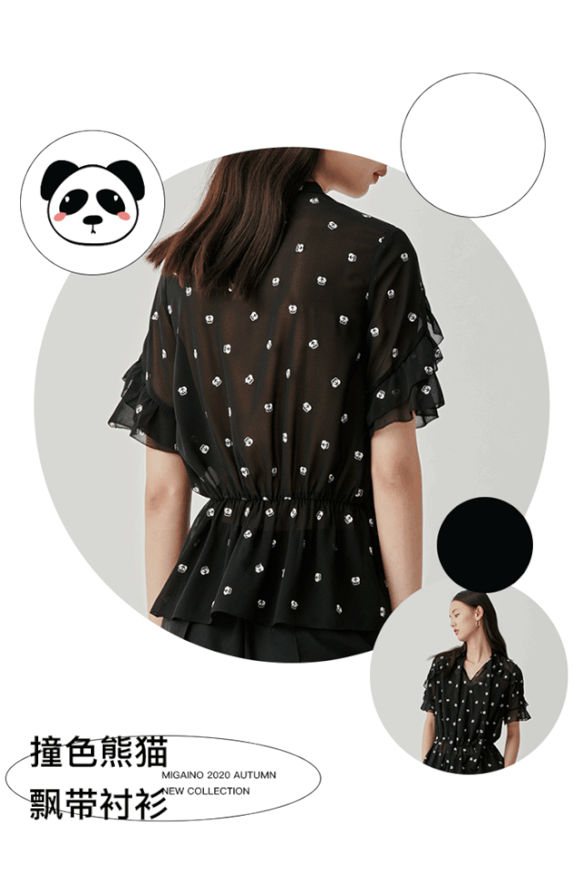 从繁琐的日常中自我「救赎」,宽松身型的雪纺衬衫设计简洁,熊猫水墨画印花带着几分中式古韵,在寡淡与喧闹之间找到平衡点;轻薄相间的同色系搭配,有飘逸感赋予的悠扬婉转,亦有垂坠感加持的自然洒脱。