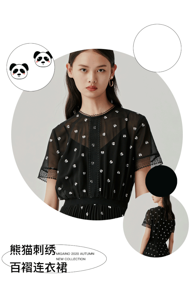用轻透雪纺制造半透明效果,让所有闷热瞬间化为乌有,薄纱材质因为熊猫刺绣的陪衬,渲染出都市女性对郊野生灵的喜爱之情;不规则百褶裙摆动静皆宜,踱步流转间,撩拨迷人的温柔魅力。