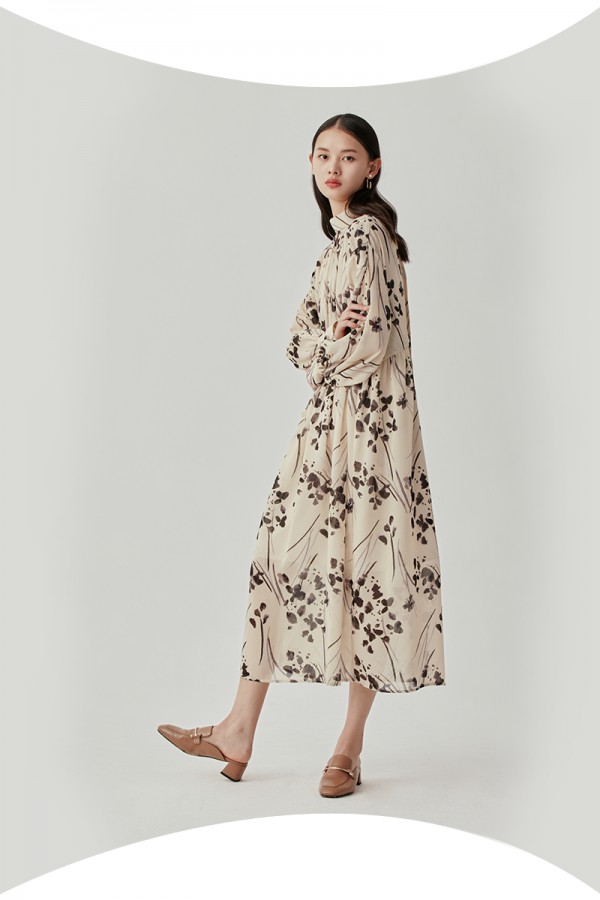 以抽象式竹林水墨图纹为核心,描绘一幅灵气生动的意境之作。纤薄的衣裙质地与傲骨文竹相得益彰,富有东方神韵的姿态之美,在生活的起伏里温柔不失风骨。