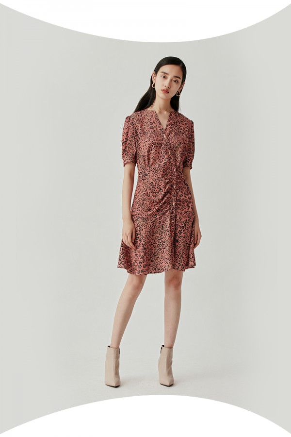 当豹纹落在玫瑰粉雪纺之上,看似不羁的笔触晕染出柔和美感,V领在分毫斟酌中再往下一公分,修饰颈部线条的同时添一丝妩媚。抽褶设计制造的视觉吸引力,成为异域风情与法式浪漫的调味剂。