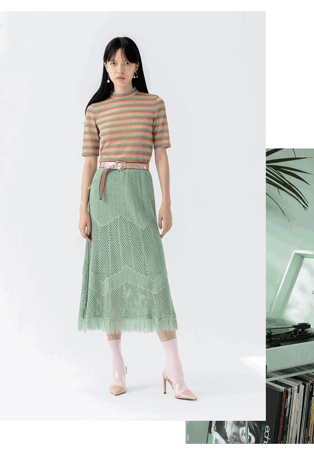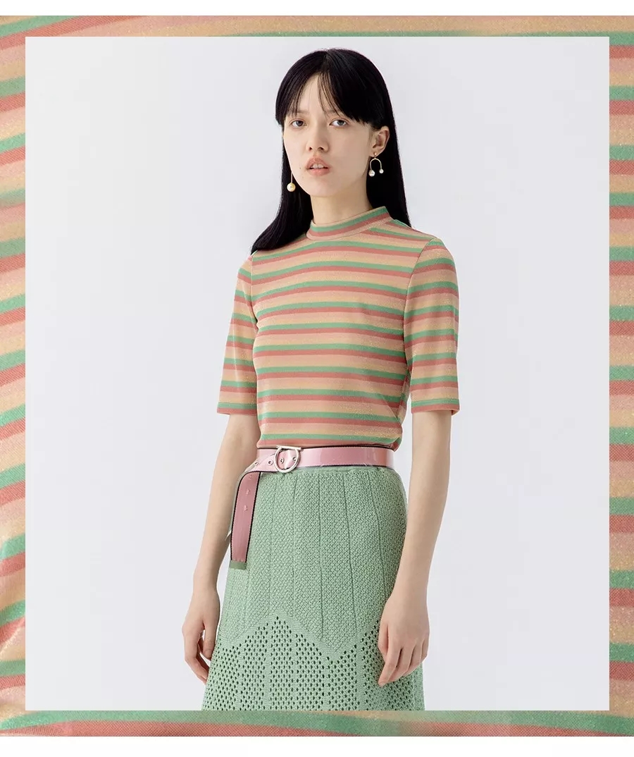 薄荷系单品独有的清新,是让人欲罢不能的关键,针织流苏半裙简约流畅,撞色条纹上衣经典百搭,竖条纹收腰上衣简约大气,撞色系缎面棒球衫既有着运动风的洒脱也有着更多灵动的味道。