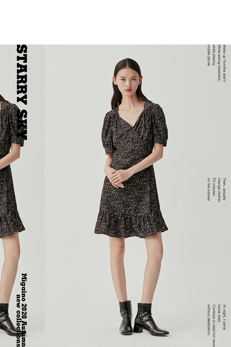 留住风卷云舒间的从容优雅,茶歇裙给城市女人一个弹性空间,束腰设计包裹着闲暇时光中的舒适惬意,顺势而裁的V领是女人味的表达,点点星光则是通往灵魂深处的诗情画意。