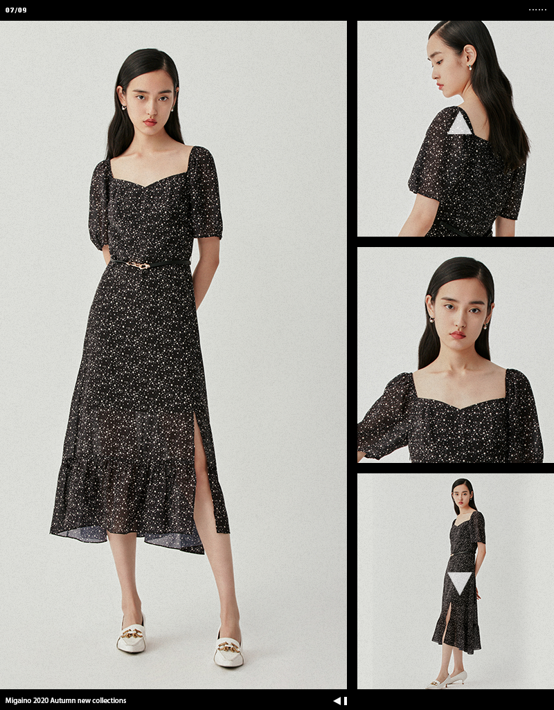 于自然光影中采集生活样本,荡漾着粼粼星光的雪纺连衣裙,珍藏对浩瀚星海的无限憧憬。含蓄矜持的欧洲宫廷风方领设计,与灯笼袖联袂出演法式复古风貌,绽放洋溢艺术展现力的城市风采。