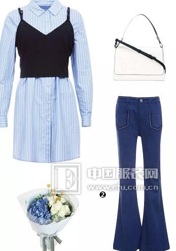 让自己变得更时髦一点吧!廓形长衬衫以蓝白条带来清新自然,搭配黑色小吊带的风潮还未退却,高腰喇叭裤是你本季的必备单品。
