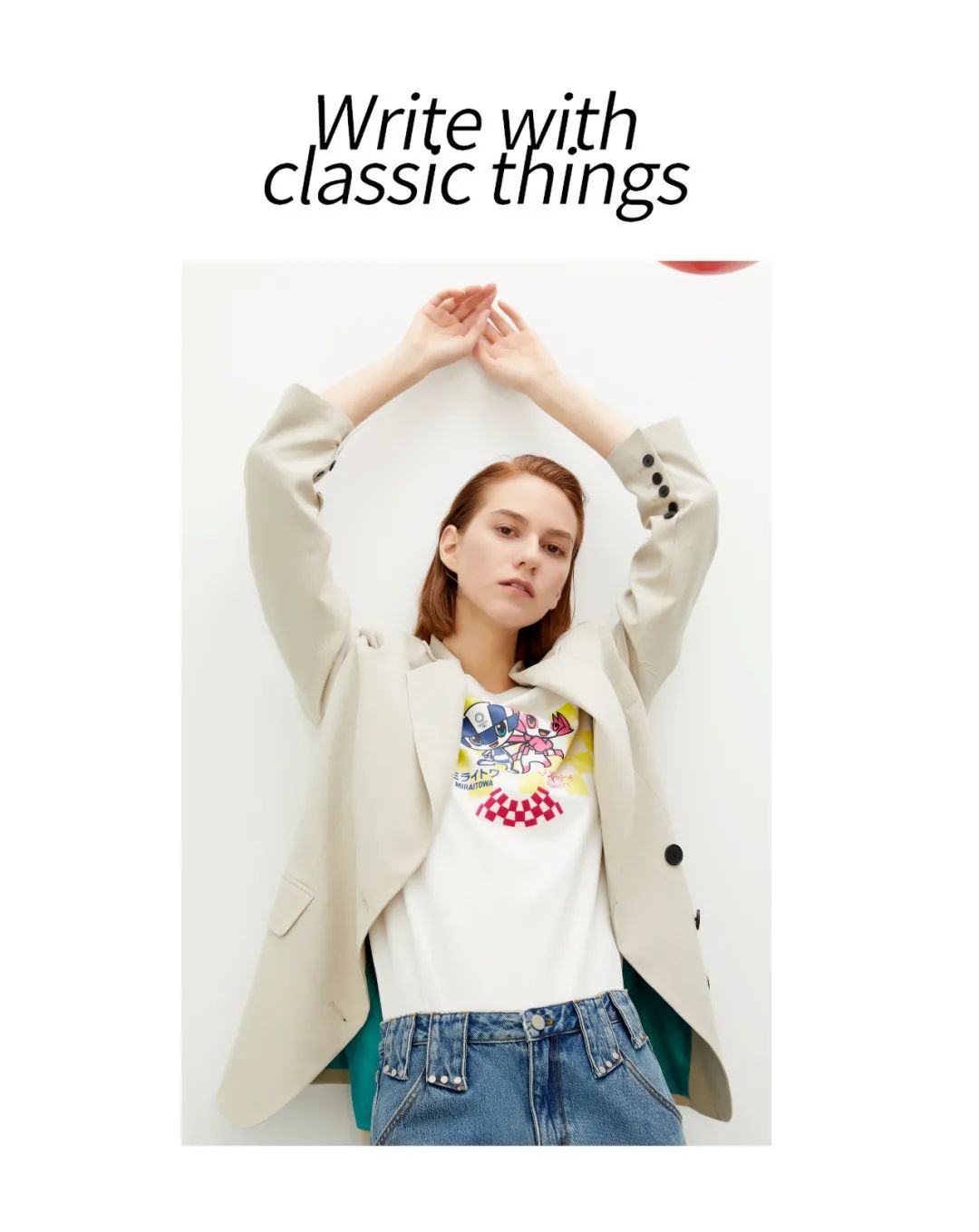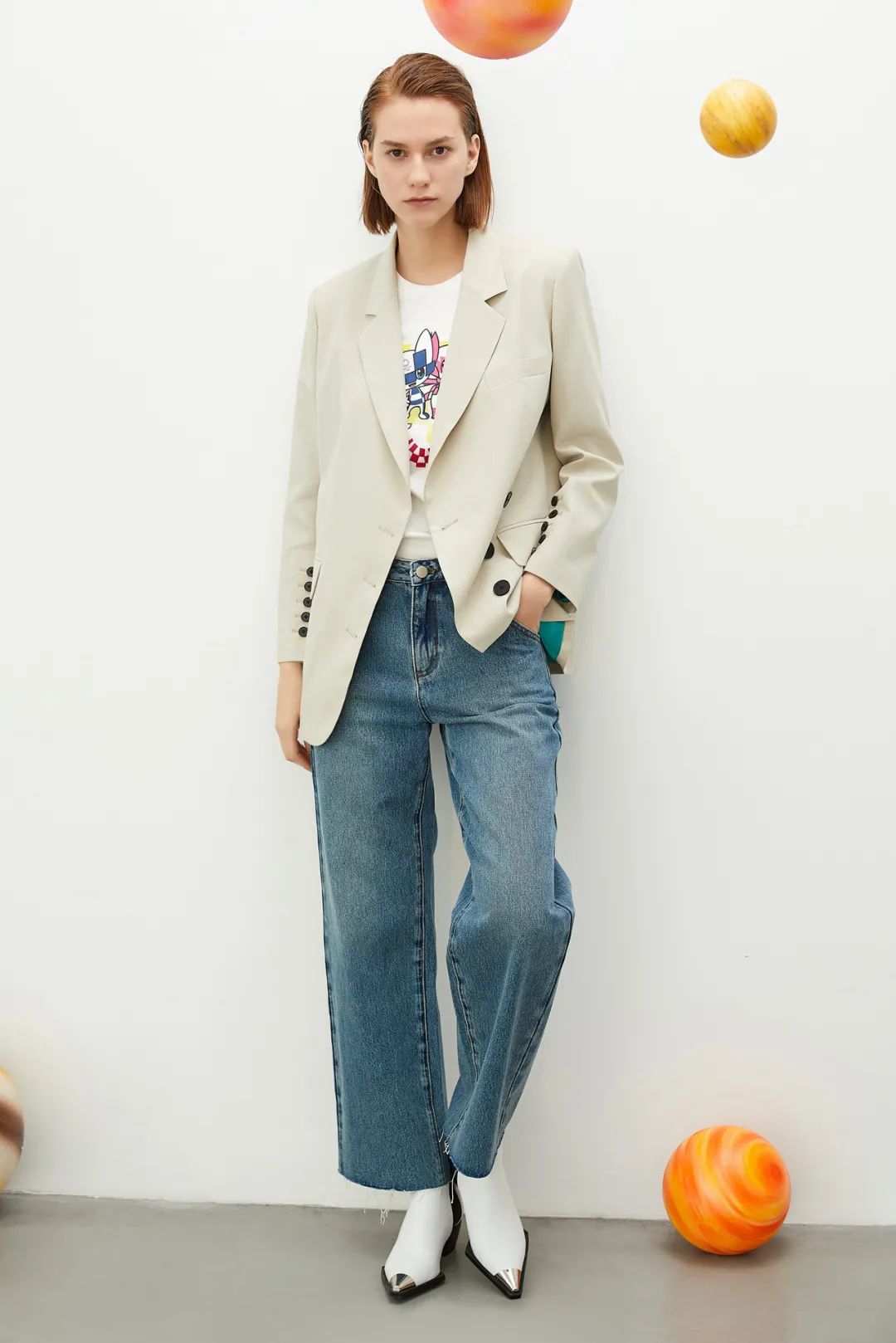 浅米色西装,垫肩增加气场与立体线条。层次的融合与丹宁单品的搭配,混搭中透露随性的穿衣态度。