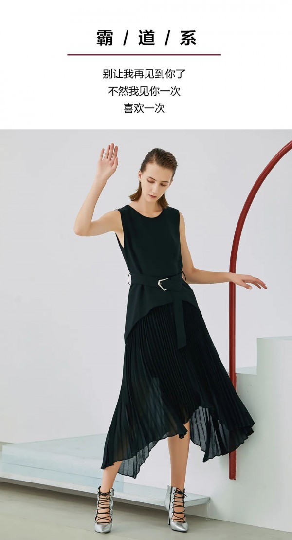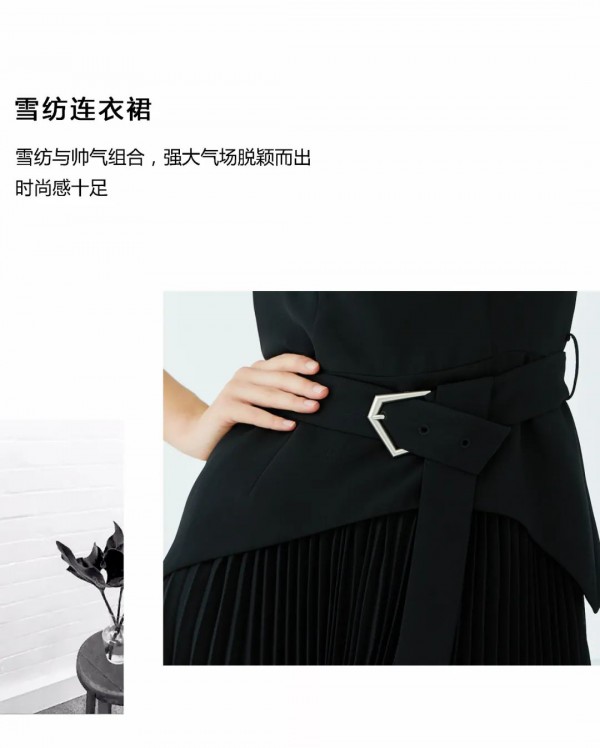 雪纺连衣裙,雪纺与帅气气组合,强大气场脱颖而出,时尚感十足。
