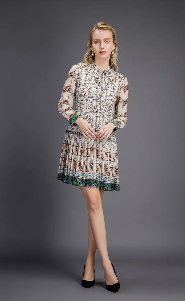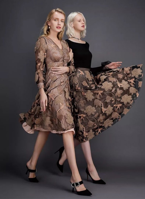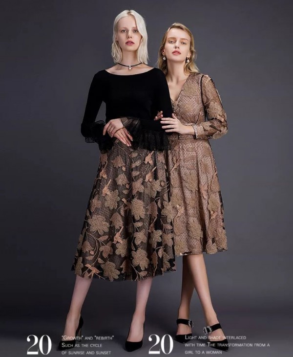 西纳维思女装2020春夏的驼色系都透出奢华的质地,太妃糖棕近乎红棕色。来自大地色系,带着与生俱来的厚重感与沉稳性;与黑色与点缀色系组合后,呈现复古优雅的色彩组合效果。