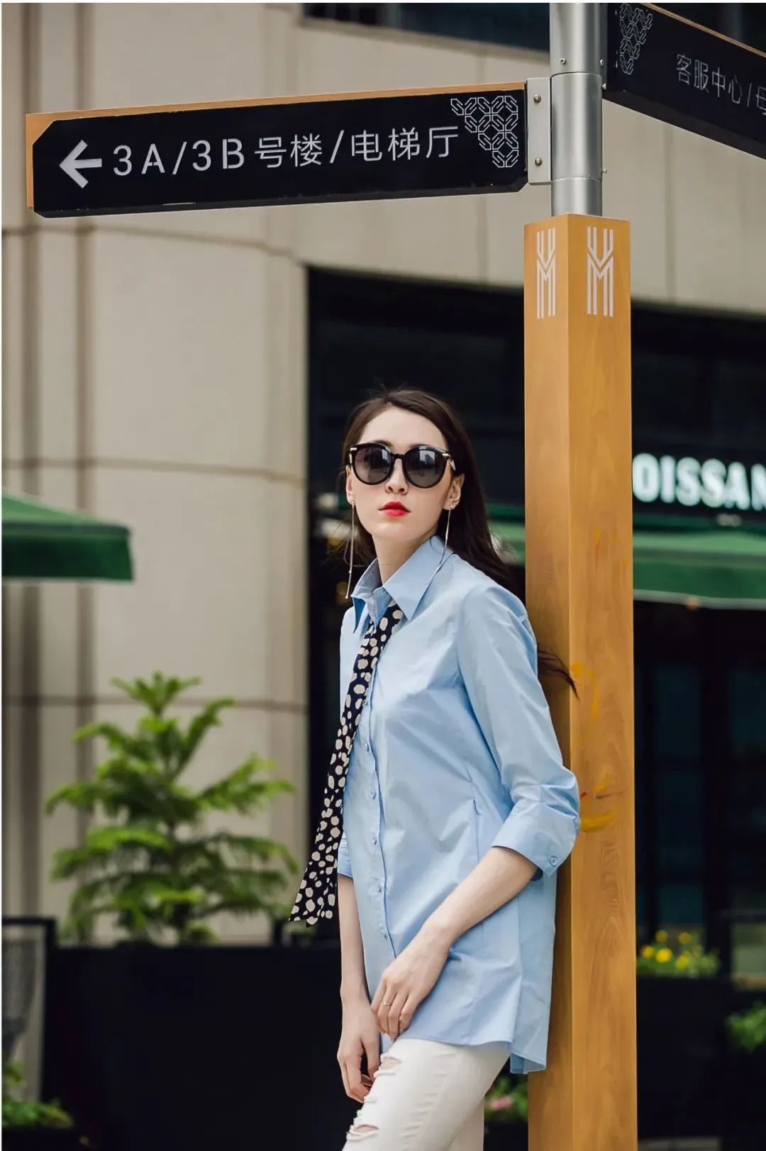 清水蓝色特别趁肤色,宽松衬衣搭配小脚裤,