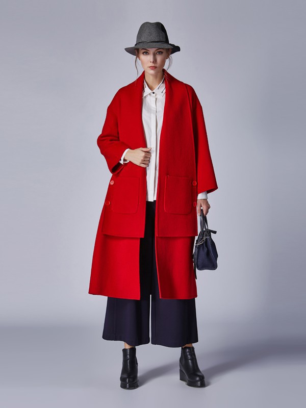这款红色的大衣穿在身上是不是很显气色而且大红色的颜色也很适合在冬季穿,版型是那种很修身的穿在身上很是简约,内搭一件白色衬衣,翻领的设计很显气质,口袋的设计很是实用也很方便,衣摆处的设计是不是很独特,下身搭配一件蓝色的阔腿裤,搭配一双高跟鞋,整体的造型优雅简约,将自己的气质穿出来。