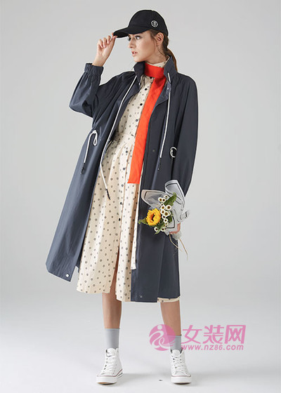 秋季里最为适合的单品,就是气质风衣。与米色连衣裙搭配,可以很好的穿出层次感和立体感。下装是深色系的直筒长裤,这样的组合设计,整体造型显得时尚而又简洁。