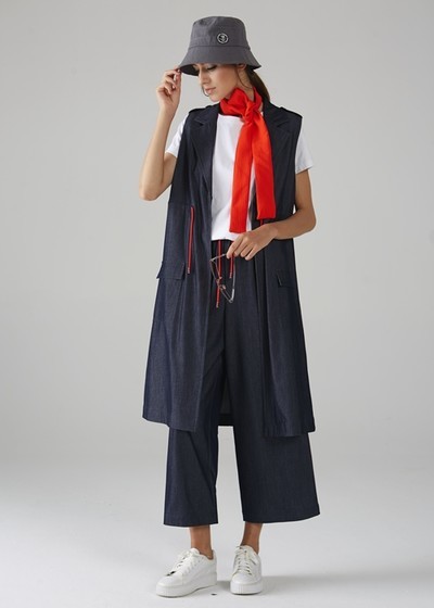 马甲在秋季里面是很受欢迎的,这件深蓝色长款马甲而又不显得张扬,不管是职场妹子或是时尚小姐姐们都超级的喜欢单品之一。可以内搭白色T恤和深色系的休闲直筒长裤,就可很轻松的穿出满满的层次感。
