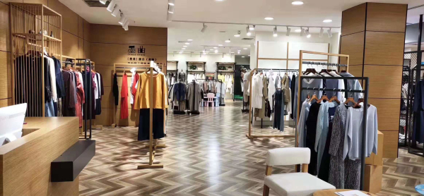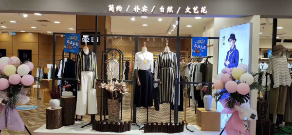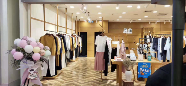 在店铺的装修上,墨曲女装这一家店铺采用了原木色的风格来搭配上墨曲女装素淡的服装风格,营造出一种超凡脱俗的气氛,开业的花篮和活动的海报也是给店铺增添了喜庆的色彩。