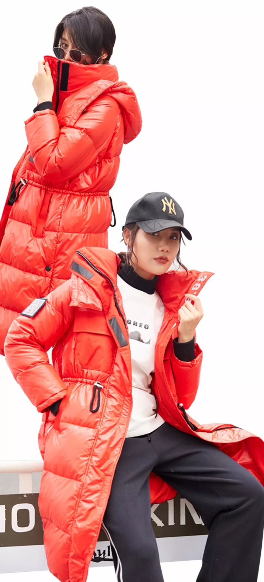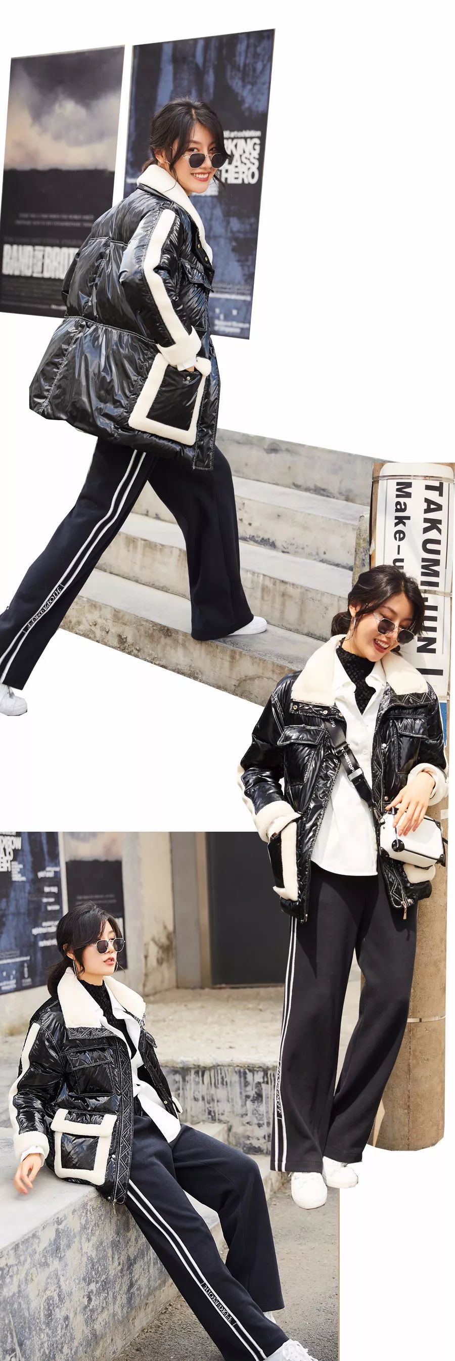 采用亮面皮质感羽绒服面料,