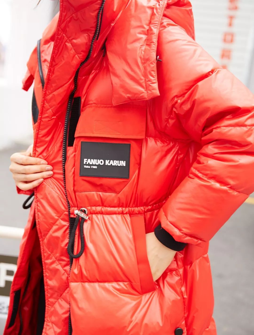腰部的抽绳及撞色拉链的设计,