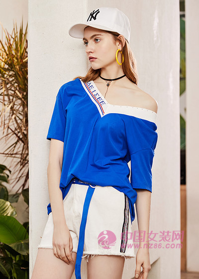 想要把白色穿的吸睛出众,那么也可以选择亮色系来进行搭配。简单基础款的白色短裤直接单穿上身会显得有些单调无趣了,搭配一条亮蓝色白边T恤,瞬间摆脱了白色带来的单调感,整套搭配充满了时尚味道。