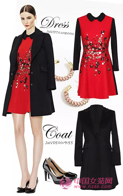 打造黄金比例视觉效果,插袋钉珠工艺处理,使整体看上去低调优雅不言不语间尽诉不凡品味,内搭正红色连身裙,红与黑的融合,反应热情与沉稳的巧妙平衡,裙身细节处梅花花型应景冬日主题,美不胜收,星之华。