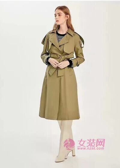 外套是秋天里必不可少的单品之一,而秋天的外套又以风衣最为经典,没有风衣做搭配的秋天,可以说是不完美的。这件暗绿色的风衣翻领加挡风片,袖子做收缩或者绑绳调节设计,长款上身比较飒一点,凸显出成熟女人味。