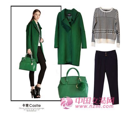 复古风尚的大翻领、简约的设计剪裁,搭配经典的黑白色调的千鸟格毛衣,再来一条质朴的铅笔裤,即刻勾勒出苗条的身材曲线。选择同色的绿色箱型包包,让初冬冷冷的气息中,中性的时尚感让你更加利落帅气,有型有格!