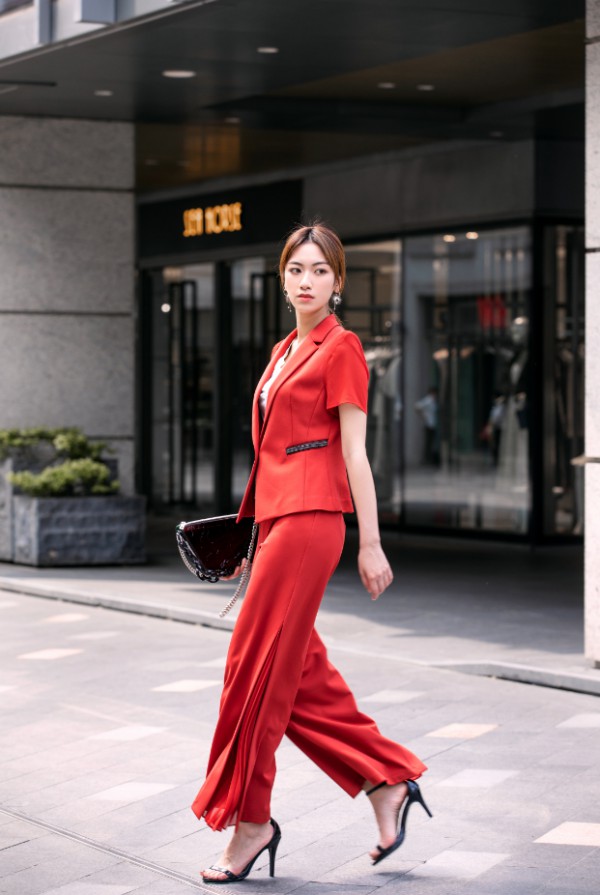 少见的红色职场套装,搭配黑色高跟鞋和手袋,立刻显得潇洒笃定。