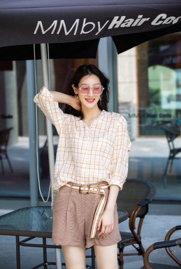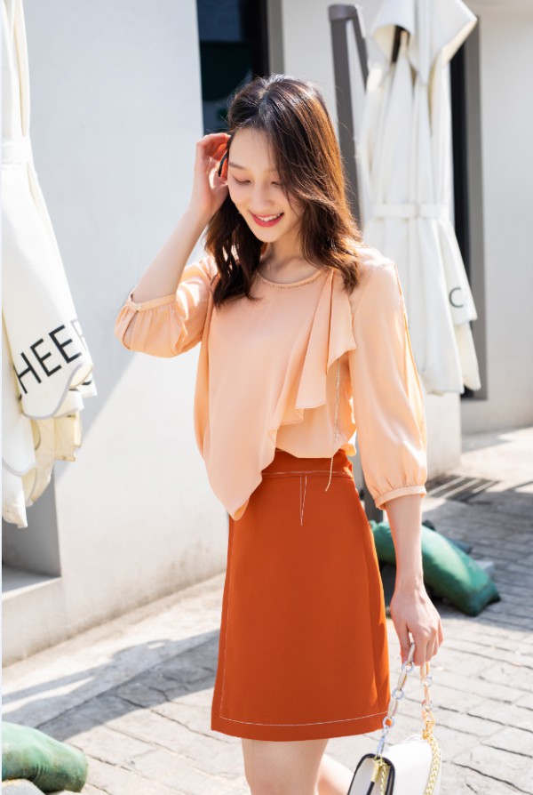 浪漫的荷叶边上衣搭配的半身裙,柔和的色调展现优雅法式风情。