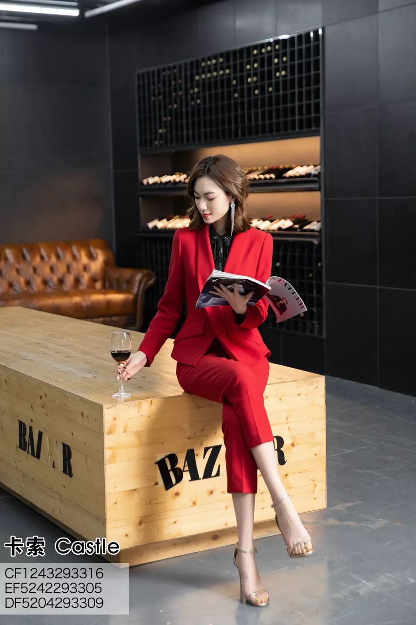 在酒会上适合这种吸睛的红色西装套装了,既酷又霸气,充满着品味与质感,经久不衰。