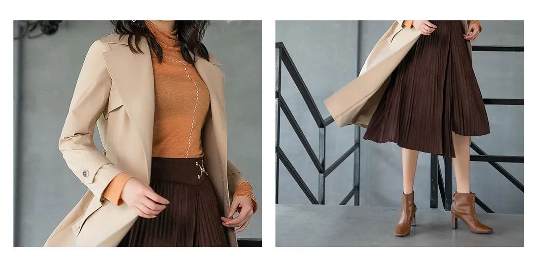 风衣采用层次剪裁、腰带、金属扣等元素,
