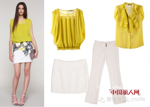 在明亮的黄色中加入一分绿,更添一份新鲜与活力。选择黄绿色系的上衣与白色包裙或者微喇长裤搭配,职业都市女性的妩媚与干练愉悦呈现。