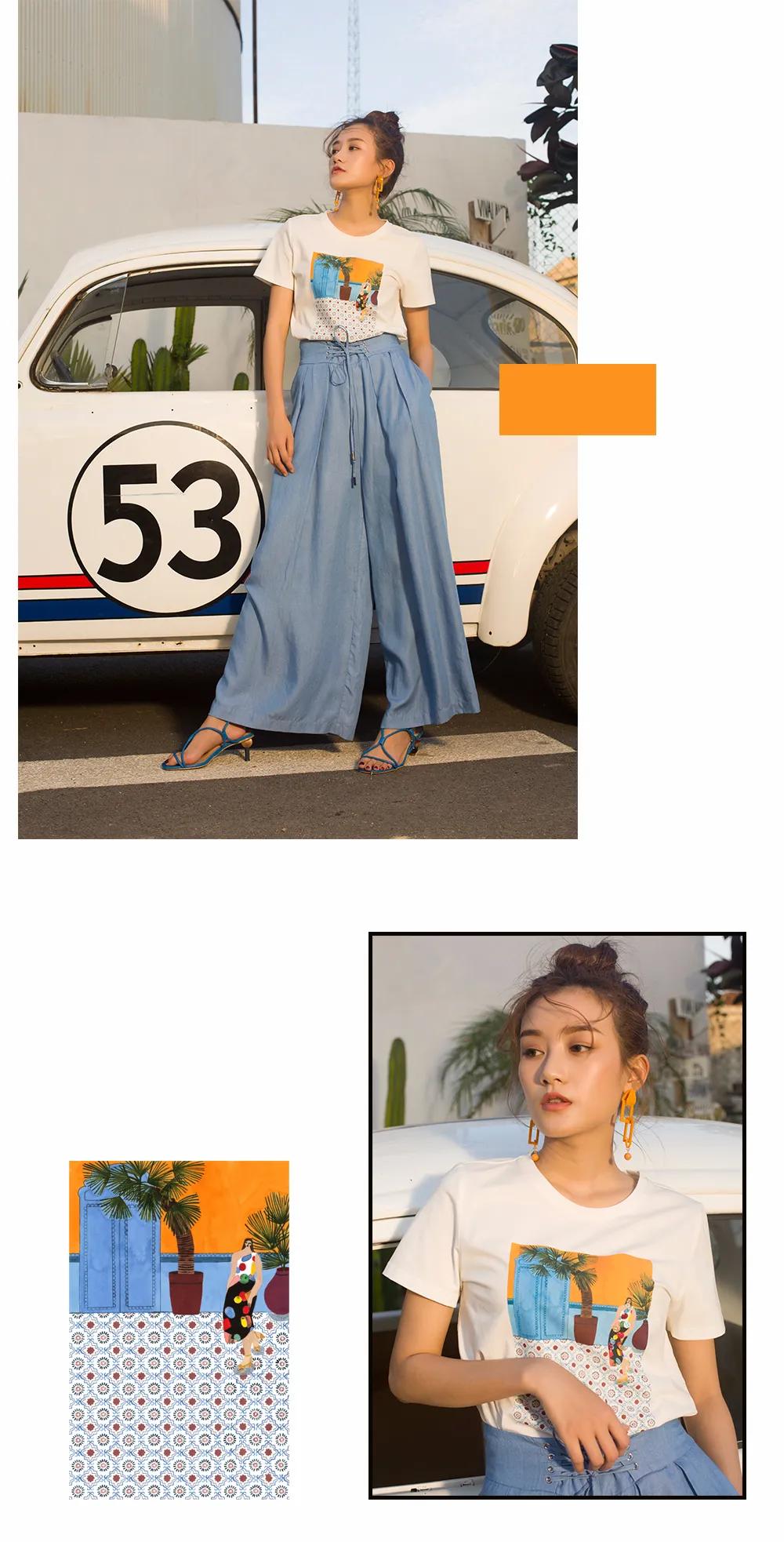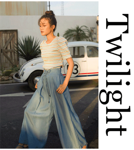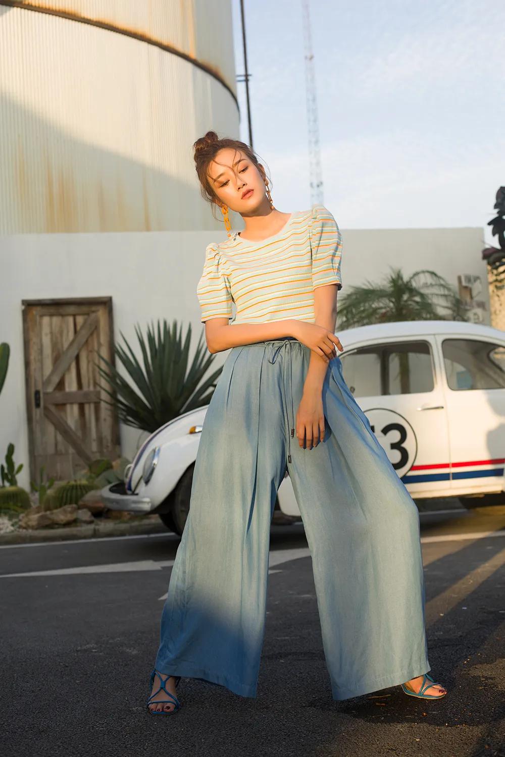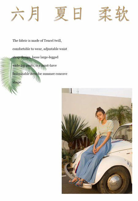 天丝斜纹的面料,宽松量感的大阔腿裤,穿着舒适,可调节的腰部绑带设计,是夏日凹造型的必备时髦单品。配以插画艺术感的白T或是条纹T,打造上紧下松的穿搭方式。