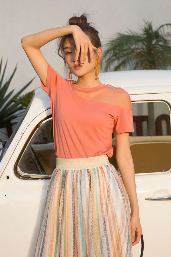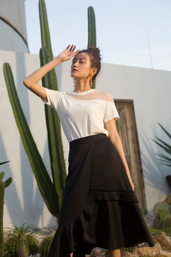 镂空的圆领T恤,不失优雅。微露香肩的小细节,碰撞出专属于夏日的清爽记忆,不对称的花瓣半裙,尽显夏日活力