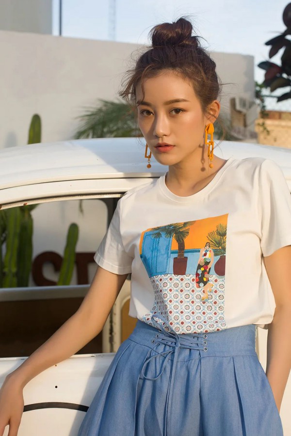 落肩的阔型更加的轻松随性,法式度假感的海报印花图案,手工感的彩色珠片装饰,让整件T恤非常的精致优雅。搭配彩色条纹半裙,同色系穿搭法则运用的淋漓尽致。