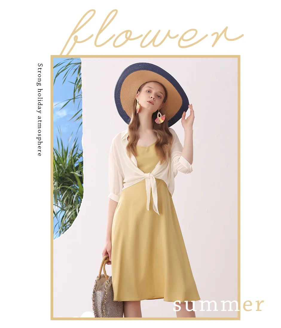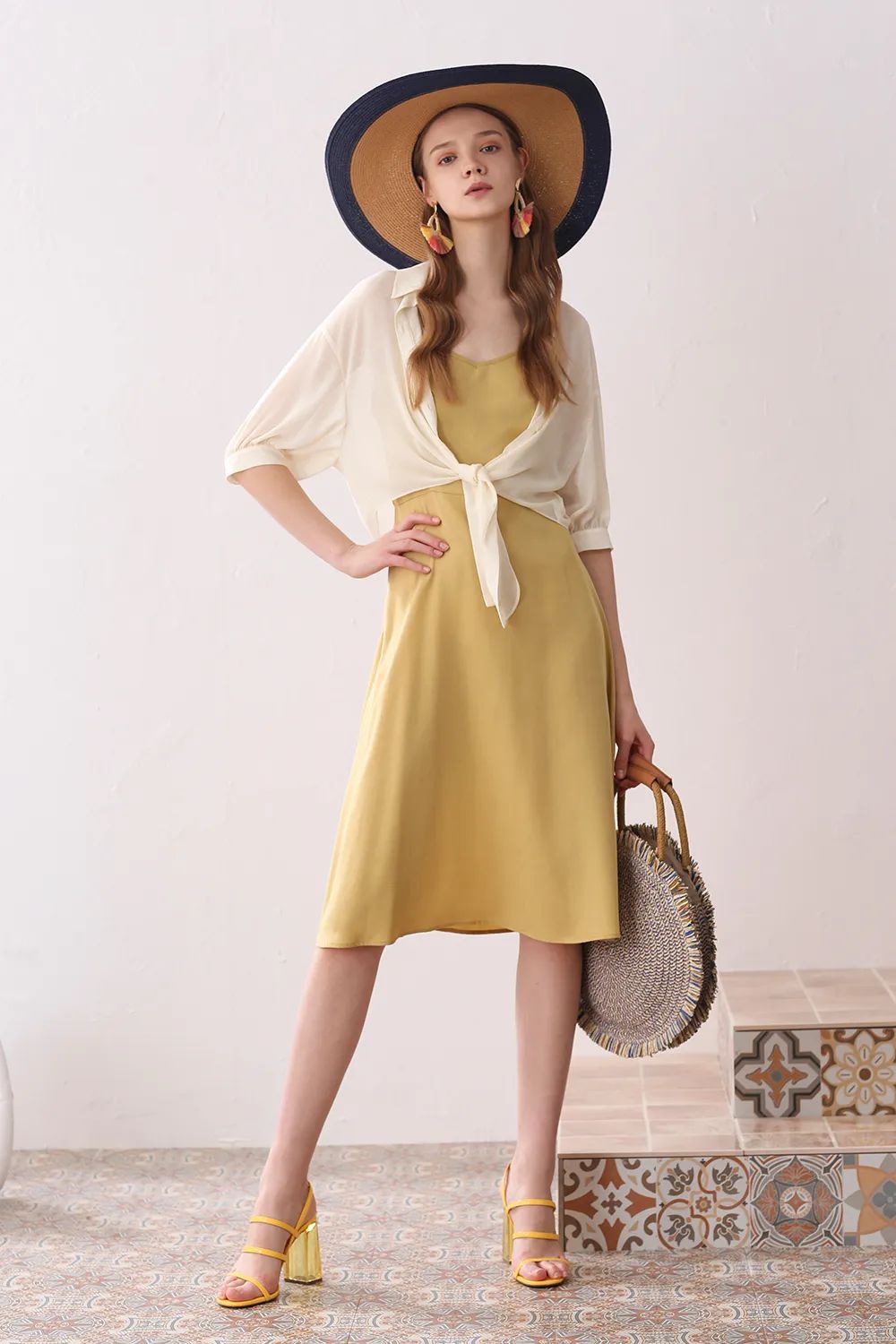 一件小雏菊色的两件套,很适合在充满芳香的花花世界,新颖的两件套搭配,外层肌理感雪纺面料,可起到防晒的作用,里层收腰A摆吊带连衣裙,浓浓的假日气息,分开穿搭的无限可能性。