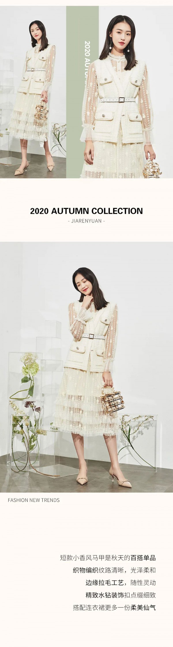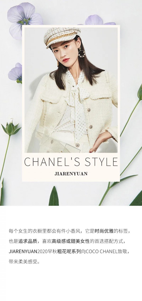 每个女生的衣橱里都会有件小香风,它是时尚优雅的标签,也是追求品质,喜欢高级感或甜美女性的***搭配方式,JIARENYUAN2020早秋粗花呢系列向COCO CHANEL致敬,带来柔美感受。