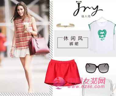 今年夏季刮起了裤裙风,简单的印花T恤搭配花苞裤裙,再加上靓丽的红色罗马凉鞋,既时尚又充满率性气质。