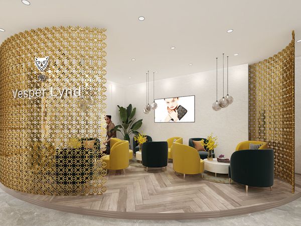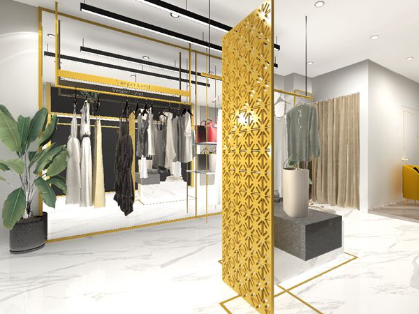 另外VesperLynd女装这种半开放式橱窗,橱窗后方增加了一个半遮半掩的金黄色背景墙,在店外可以透过背景板隐约的看到店铺的情况,这样的橱窗可以说具有很好的品牌神秘感,在兼顾橱窗完整性的同时,也能向顾客展示店内的商品局部信息,大概与古代美人犹抱琵琶半遮面是同理的吧。