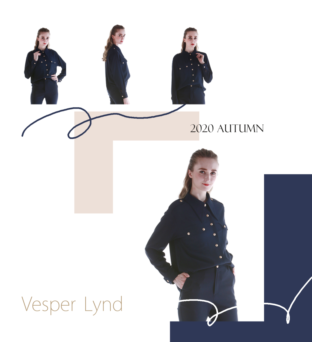 西装式衬衣以柔软面料表现,增加几分优雅,中和西装给人的距离感,高贵的藏蓝色搭配金属排扣不失英气,垂坠感十足的面料从视觉上增加利落的精英气质。