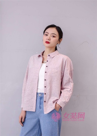 一件白T恤,下扎进牛仔长裤,再外搭一件粉色衬衣外套,搭配很是干练随性。小巧饰品加以点缀,尽显简约大方,时髦度满分。