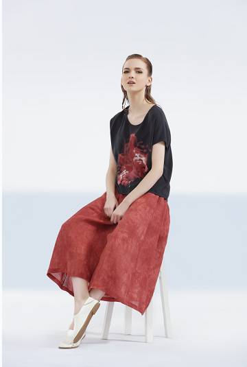 酒红色经典颜色,搭配藏青色,有韵味下身不规则立体裁剪上身,酒红印花复古花纹间接,日常逛街必备之选。