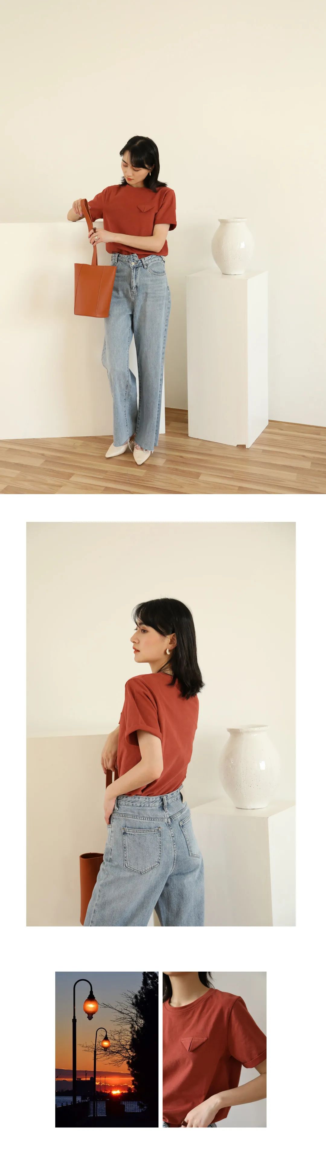 橘红色系的上衣搭配蓝色牛仔裤,百搭又吸睛