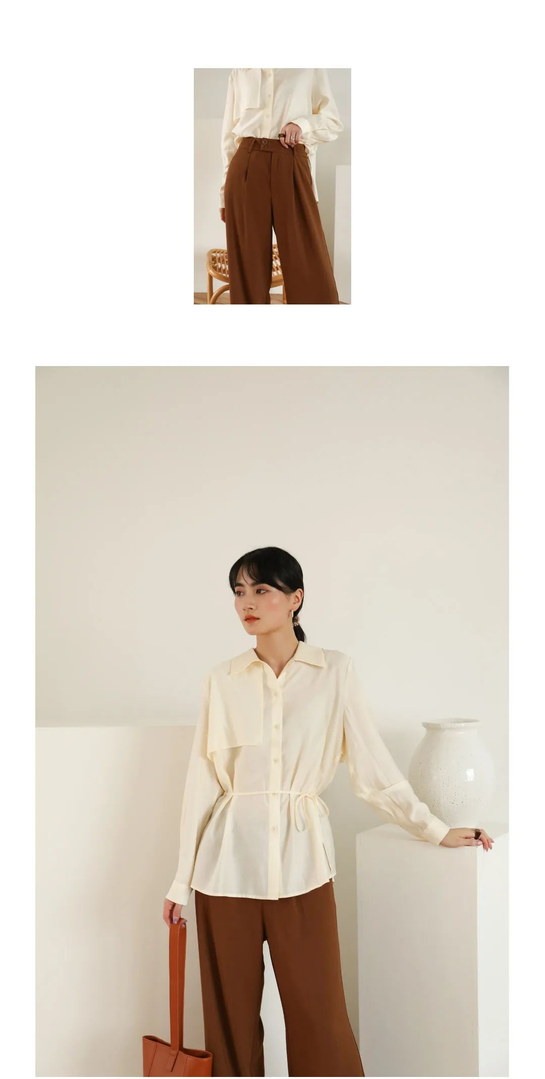 米色的优雅衬衫搭配垂感的直筒时装