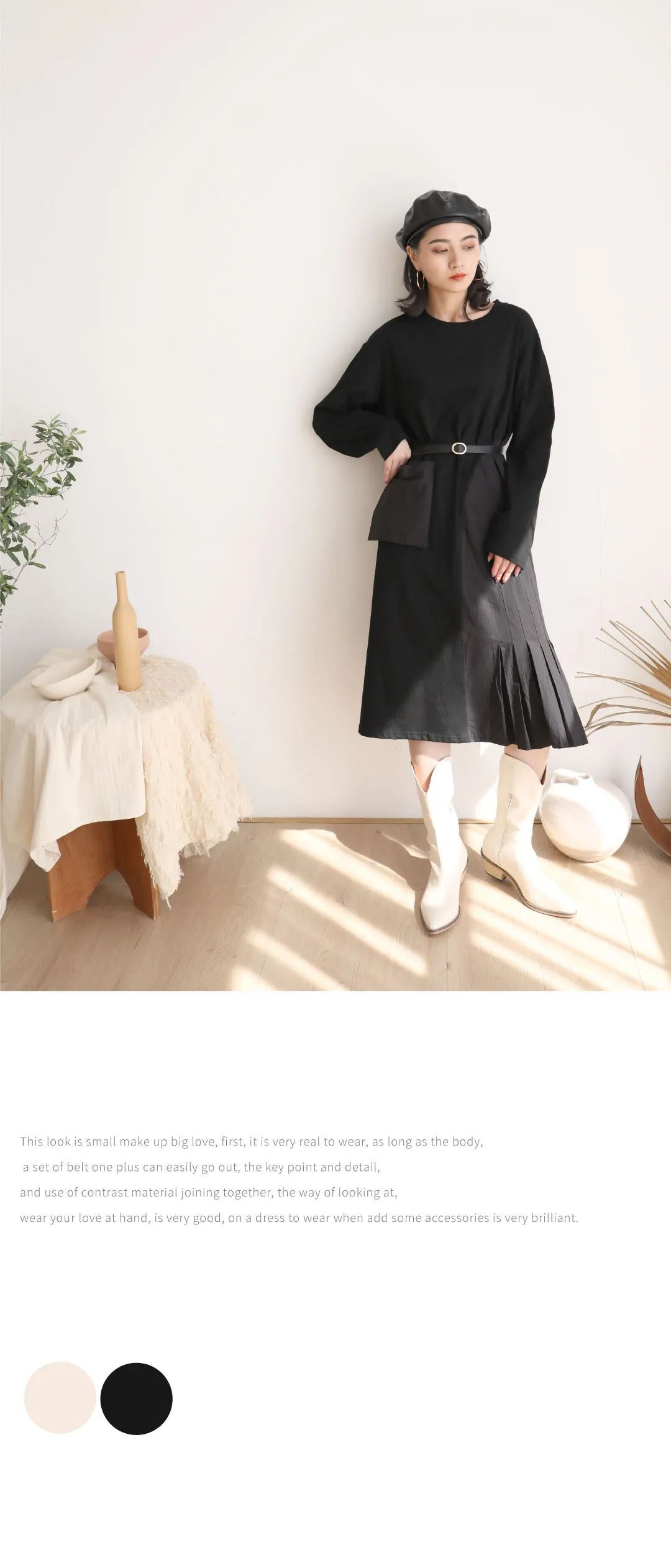 这套look是小编大爱,首先它非常的实穿,只要往身上一套,腰带一加就可以轻松出门了,关键还有细节点,也是运用了材质对比的方式进行了拼接,看着平平,穿上身爱不惜手,非常好驾驭的一件连衣裙,穿搭时加点配饰就很出彩了。
