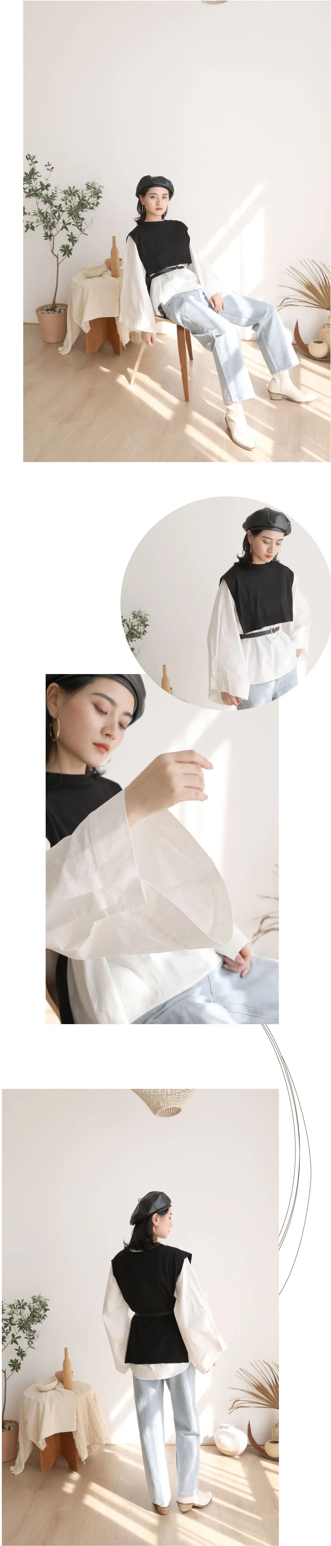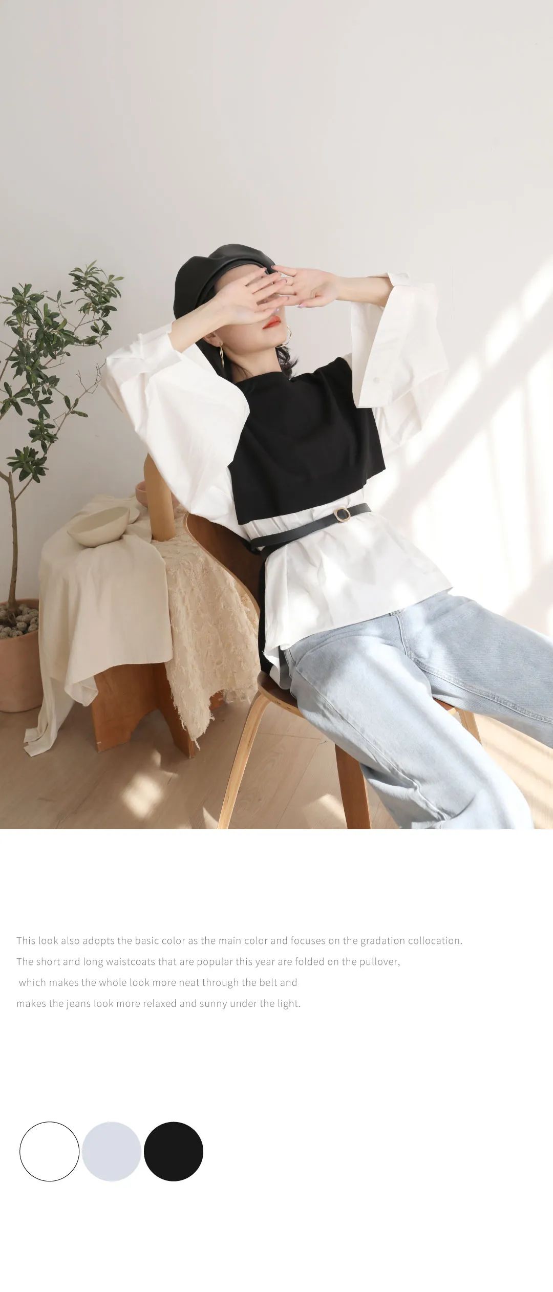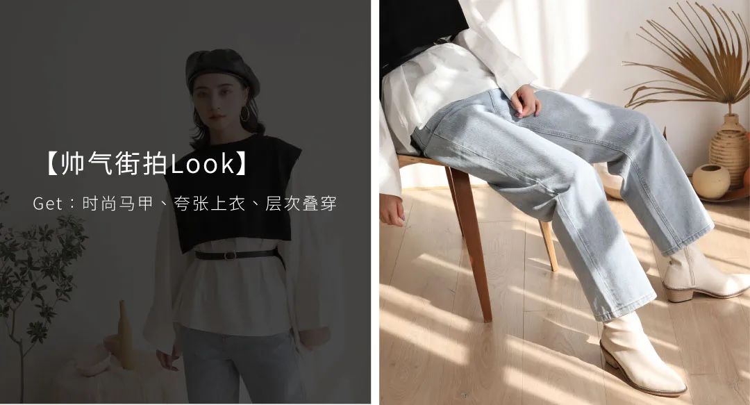 本look也是采用基础色为主色调,重点在于层次搭配啦,今年比较流行的长短款马甲叠穿在套头衫上,通过腰带让整体更加利落,搭配牛仔裤在光线下显得更加的轻松阳光。