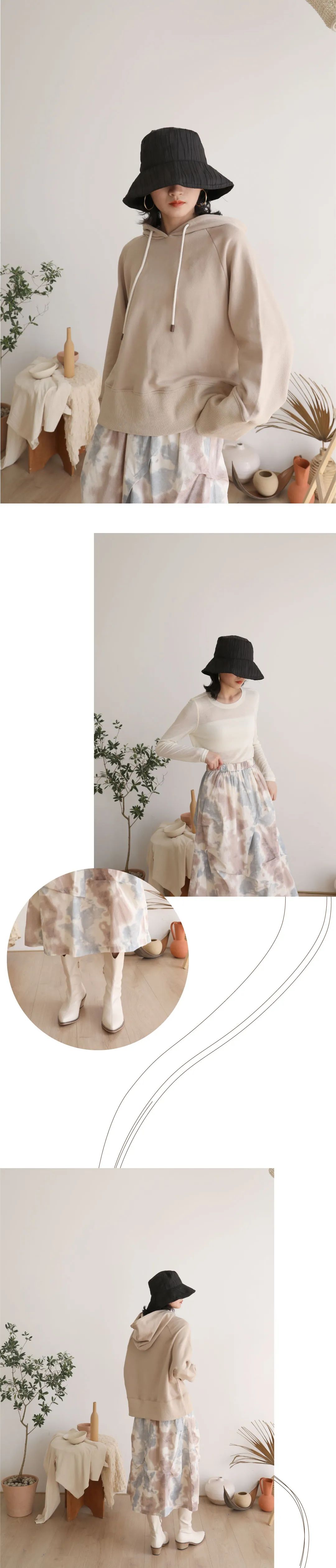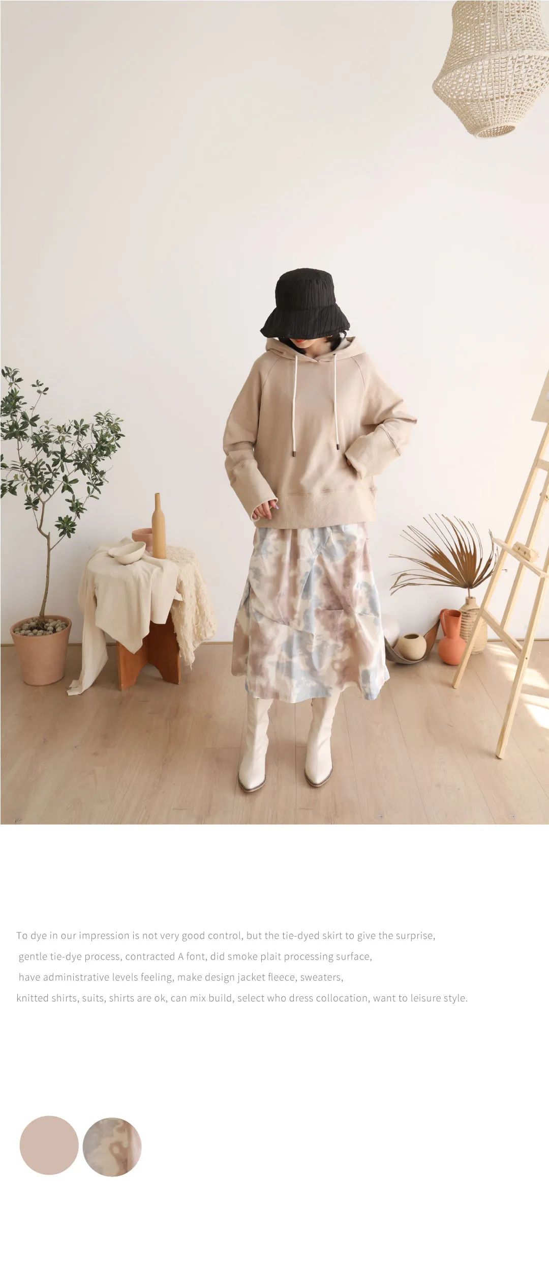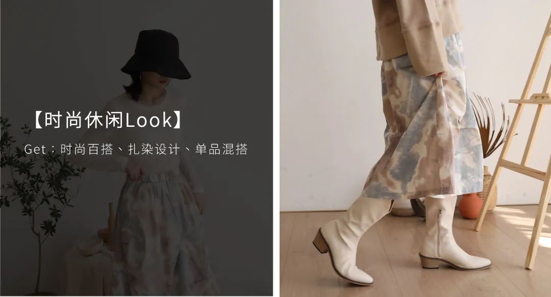 扎染在我们印象中是不太好驾驭,但是这件扎染的半裙给到了惊喜哦,温柔的扎染工艺、简约的A字型,表面做了抽褶处理,让设计有层次感,搭配卫衣、毛衣、针织衫、西服、衬衫都很ok,可以进行混搭,这里选择卫衣搭配,想要呈现休闲的风格。