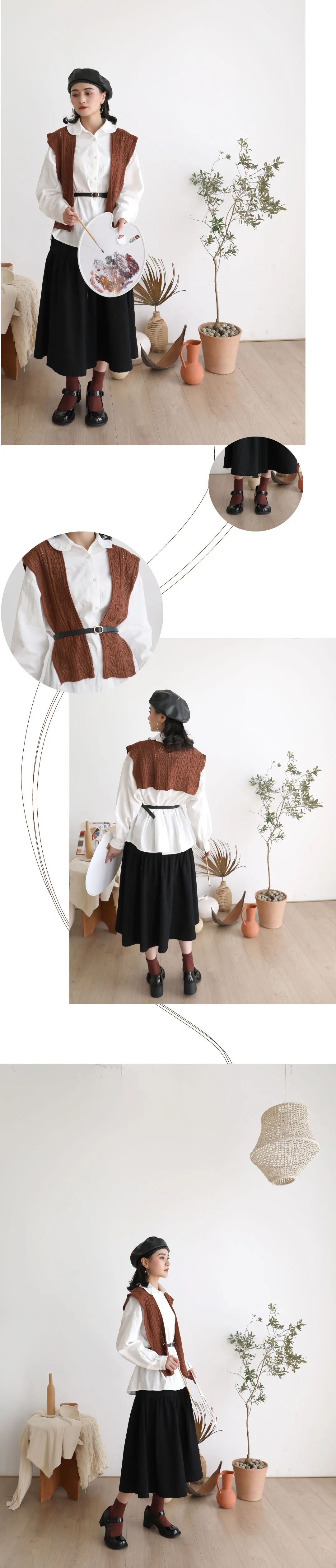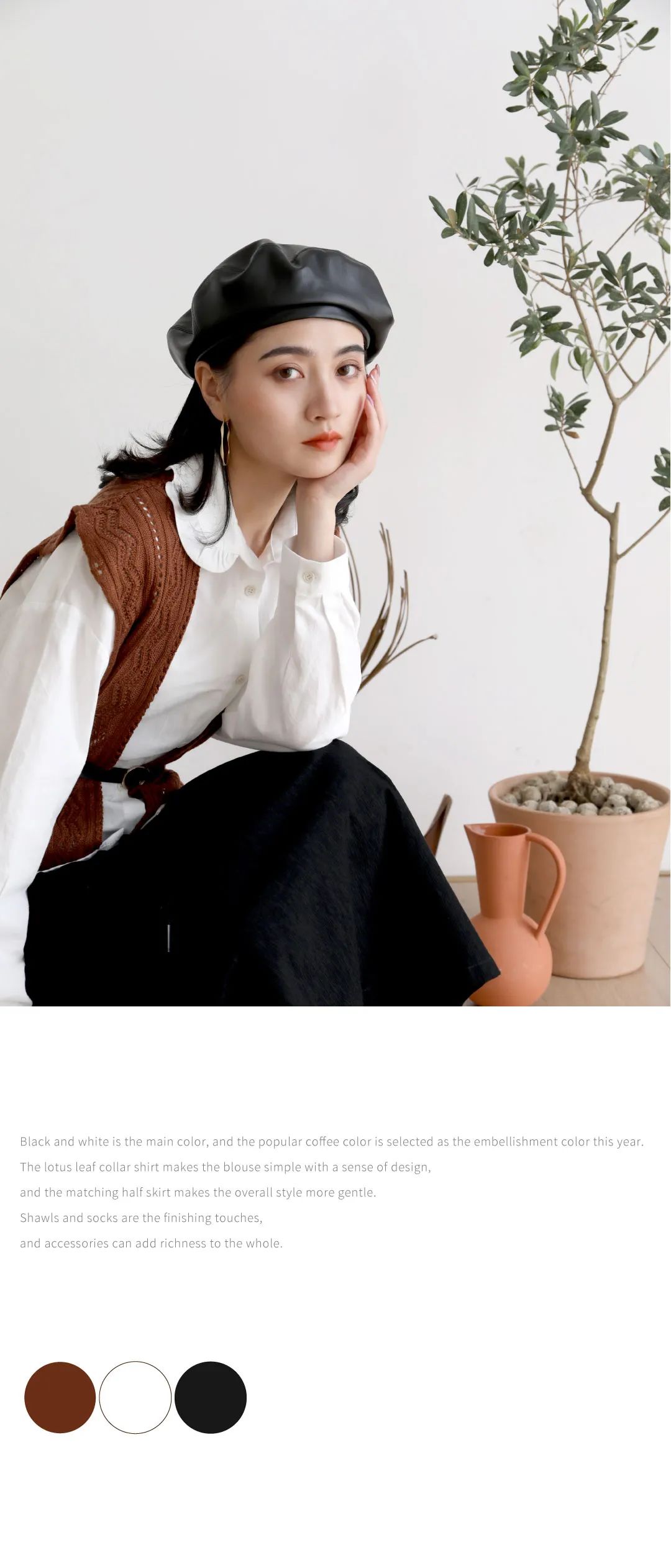 以黑白色系为主色,选择今年流行的咖色系作为点缀色。荷叶领衬衫单品让上衣简约中带有设计感,搭配半裙让整体风格更加的温柔。披肩和袜子就是点睛作用啦,配饰能为整体添加丰富度。