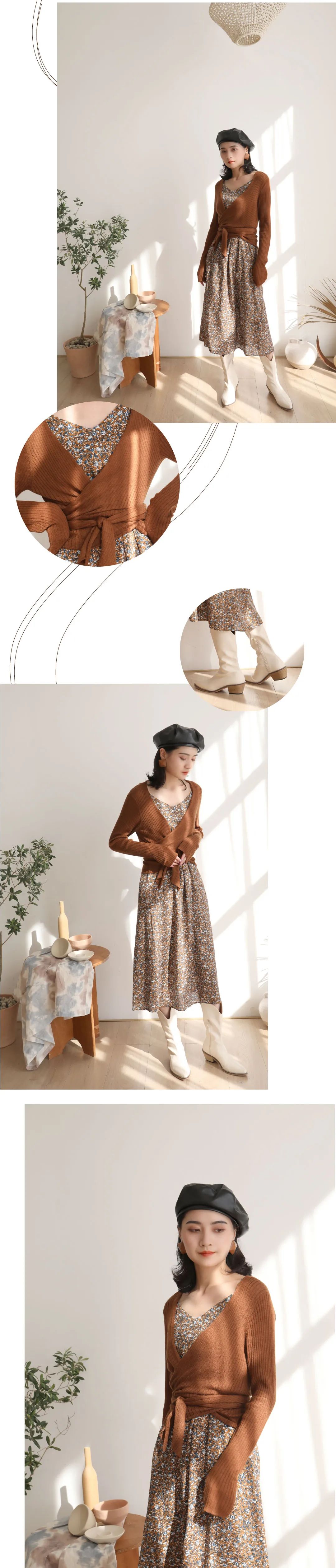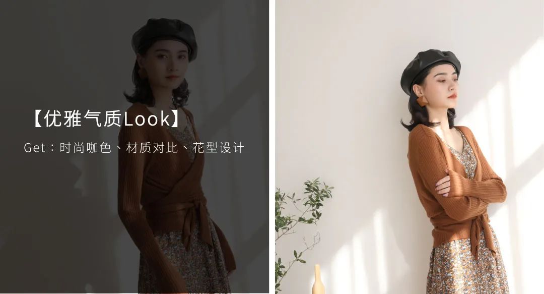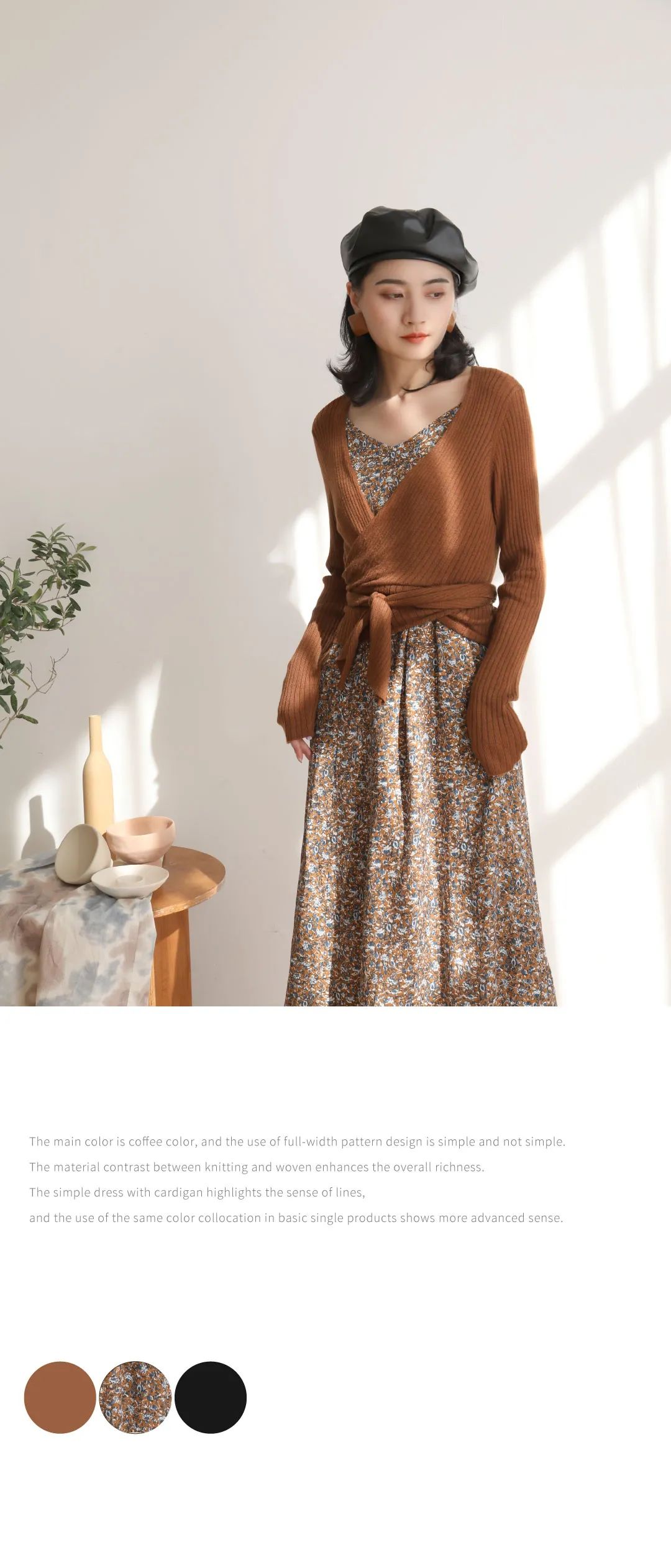 以咖色为主色,运用满幅的花型设计简约不简单,针织与梭织的材质对比增强整体的丰富度,简约连衣裙搭配针织开衫凸显线条感,在基础的单品中运用同色系的搭配更显高级感。