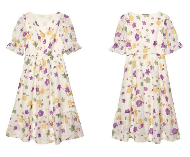 该款连衣裙可爱的花朵印花,清新减龄,美好宛如春天的感觉,经典收腰X廓形,复古喇叭袖设计,凸显不俗气质,大裙摆修饰下半身线条,轻松好穿,走路都带气场。