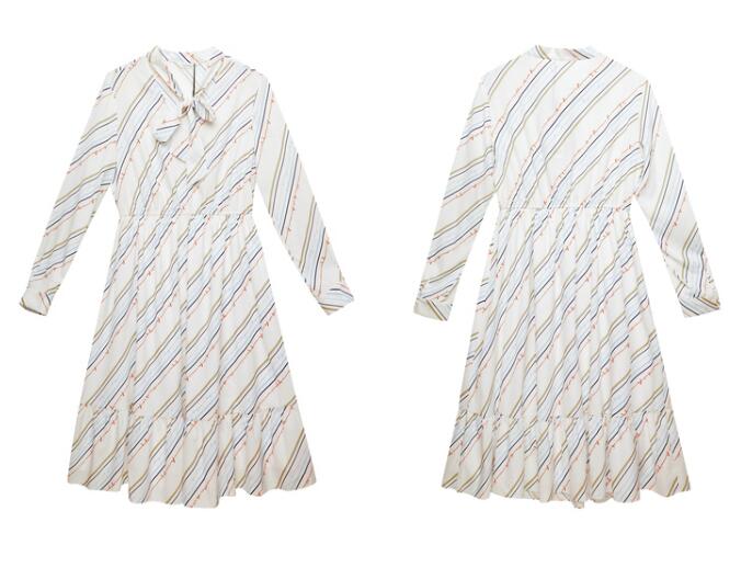 三彩新款系带V领收腰显瘦条纹印花连衣裙