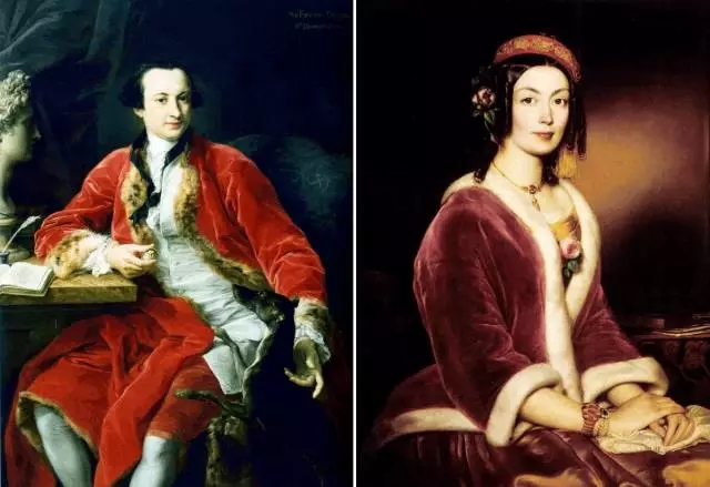 左边是1758年画家Pompeo Batoni的作品,画中可能是一位达官贵族,穿的也是红丝绒袍子~右边是1850年的作品《穿丝绒外套的女人》。