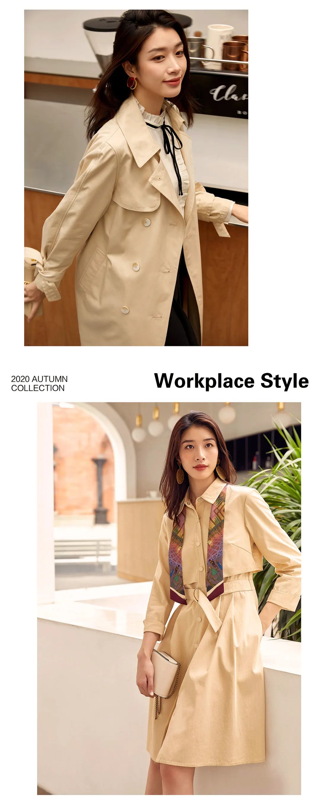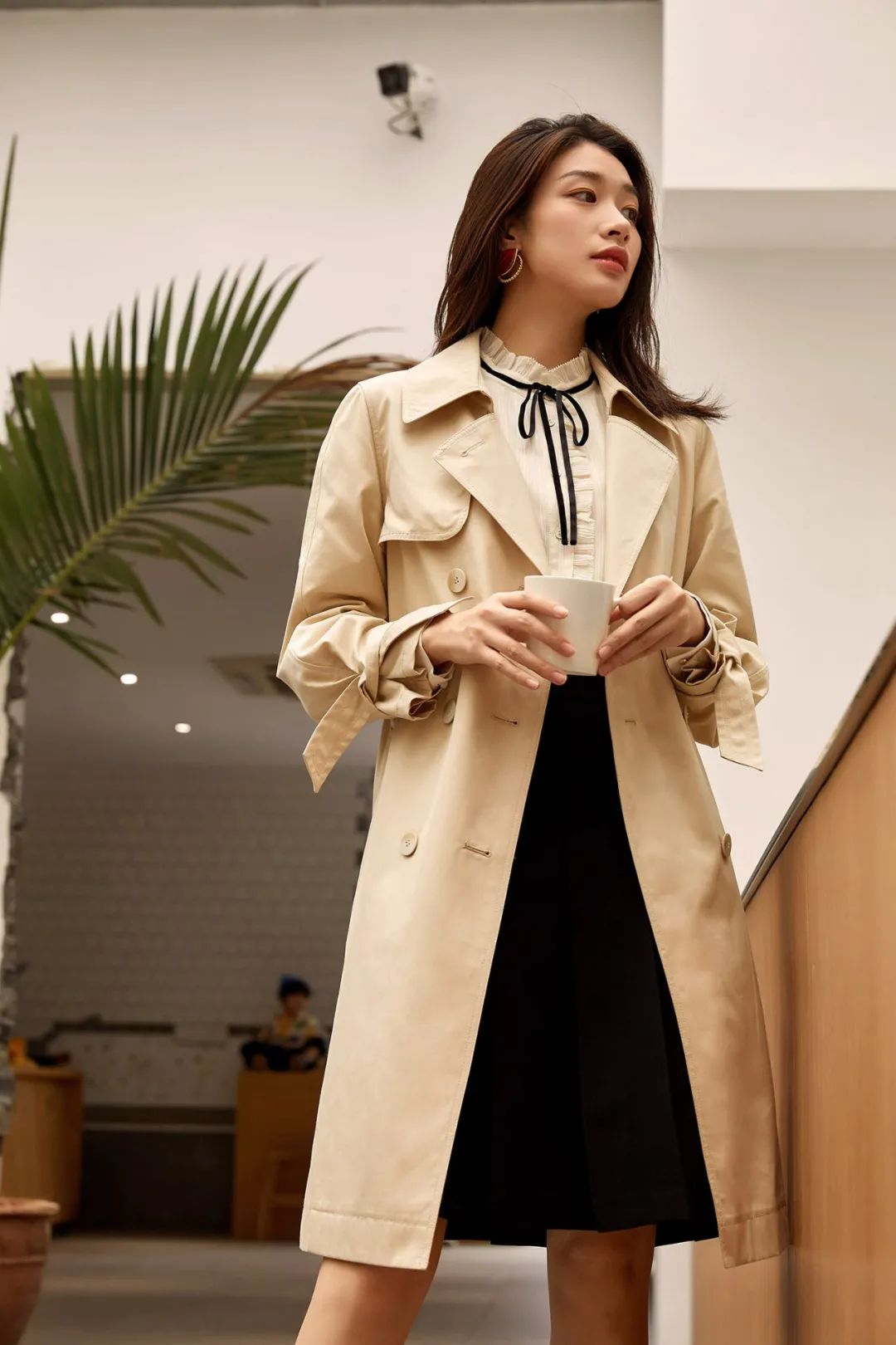 裙装式风衣,强调腰线比例精准勾勒女性曲线魅力可单穿可外套,工作生活轻松切换美女与野兽场景撞色丝巾行走繁华都市间,彰显个性亮点