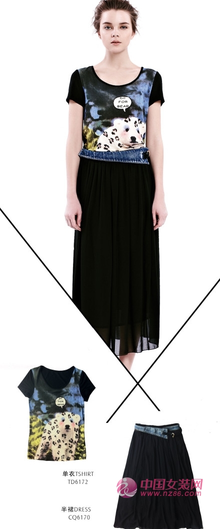 上身可爱小豹T恤衫,下身雪纺黑色长裙,腰部用牛仔元素加以过渡,打造完美女神范儿!